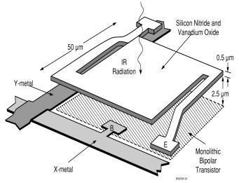 The temperature of the platelet and therefore the intensity of the radiation can be measured by the change in resistance of an electrical resistor deposited on the platelet -- the microbolometer sensor. It can be measured by a thermocouple with the hot junction on the platelet and the reference junction on the substrate -- the thermoelectric sensor. Or it can be measured by an electrical capacitance effect -- the pyroelectric sensor. The microbolometer was developed by Honeywell and is used in Infrared Solutions, Inc. cameras.