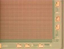 It consists of a two-layer structure. An interconnecting readout circuitry is applied to the silicon process wafer and then the microbolometer structure is built on top of the readout circuitry. First a pattern of islands _ wavelength thick are deposited on the readout circuitry. The islands are made of a material that can be selectively etched away later to form a bridge structure. Three layers -- silicon nitride, vanadium oxide, and silicon nitride -- are deposited over the sacrificial islands. The sacrificial islands are then etched away leaving the thermally isolated bridge structure of vanadium oxide. A photo of an early Honeywell microbolometer element is shown in the picture below followed by a photo of one corner of a 320 by 240 microbolometer array |