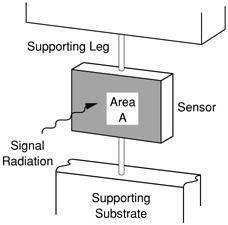 紅外熱傳感器原理圖如右圖所示。A tiny thin plate (which I call a “platelet”) is made on a silicon wafer in a silicon foundry by a micro-machining process. The platelet is typically 50 m (microns) square by 0.5 m thick. Even smaller sizes are under development. Long thin support legs and a vacuum environment thermally isolates it from the substrate. Small thermal radiation from the target focused onto the platelet heats it. The higher the target temperature, the greater the focused radiation is and therefore the higher the platelet temperature.